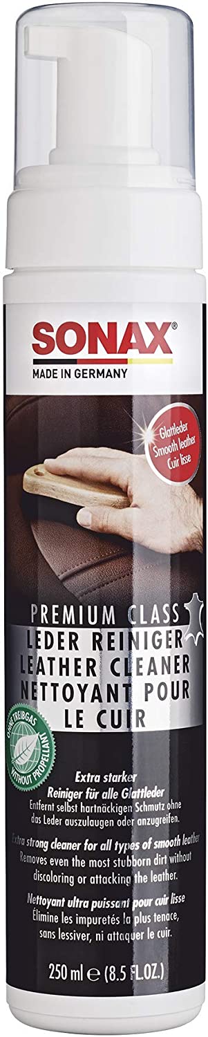 SONAX Premium Class Leather Cleaner effectively cleans of all types of smooth leather. Especially fast acting, with intensive effect and maximum material compatibility. Removes even the most stubborn dirt such as grease and staining of jeans without leaching out or attacking the leather. With foam dispersion for especially easy application and effective dosing. Suitable for all smooth leather, also for perforated leather surfaces and seats with seat heating. Do not use on aniline, nubuck, velours or suede leathers. Works well with Sonax Microfiber Drying Cloths (Item Number 450800) and Sonax Textile and Leather Brush (Item Number 416741).
